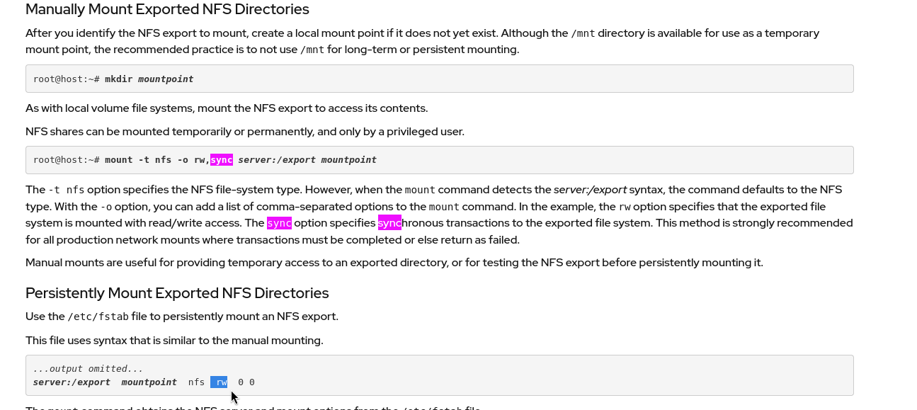 rh0042l-10.0 + Just a quick comment, the manual NFS mount example emphasizes the "sync" mount option, but then omits it in the following fstab example. It would feel more natural if both examples were consistent.