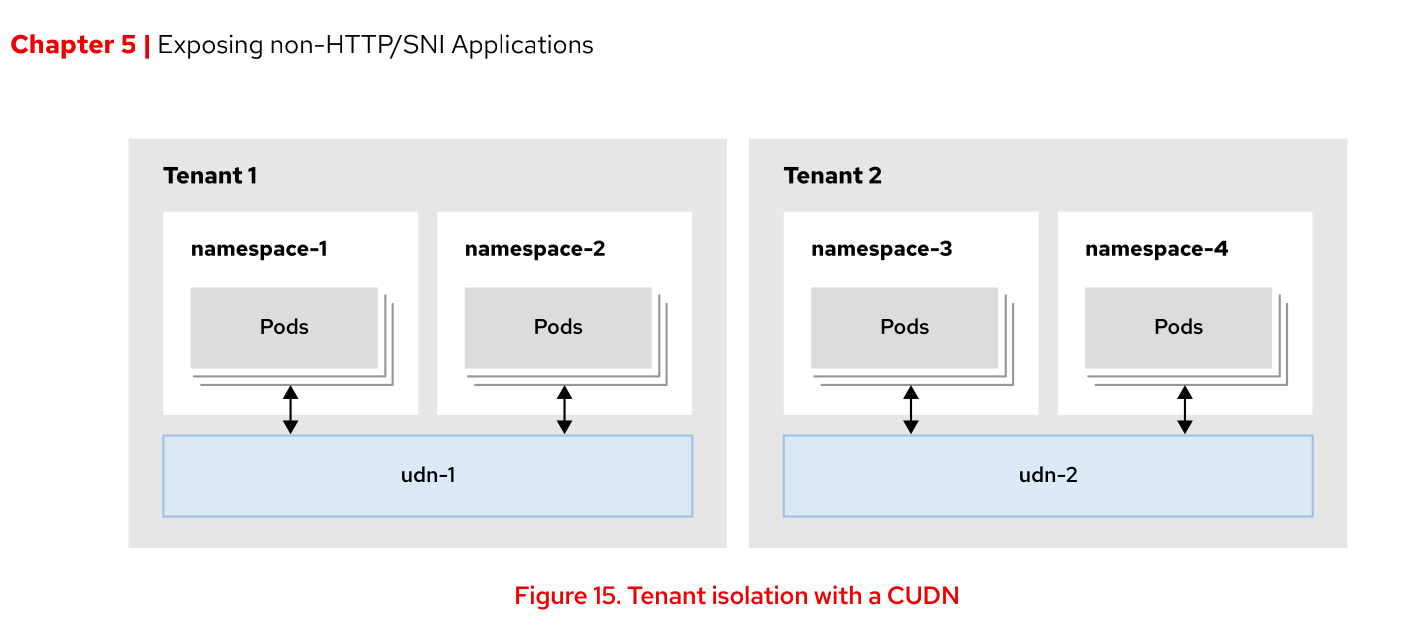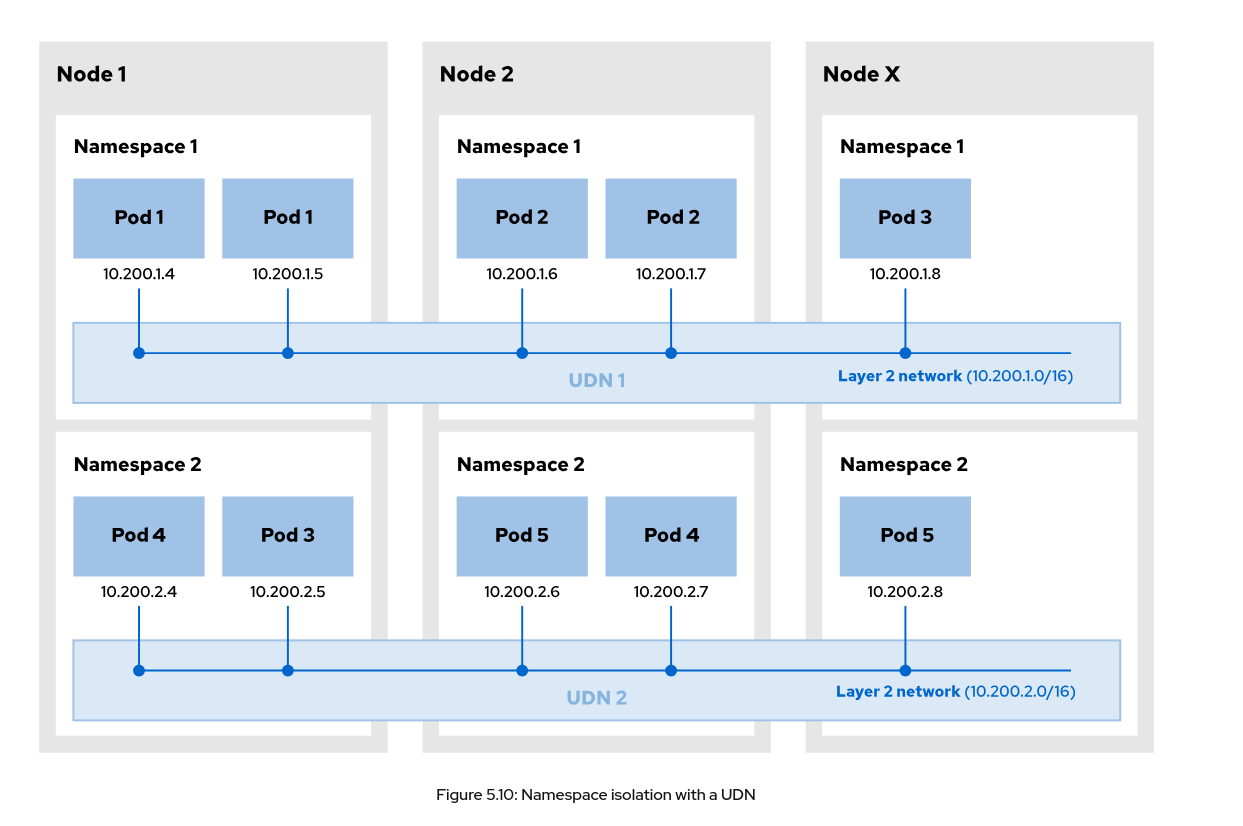 - Following on from the above bullet point there is a section that currently starts with “UDNs provide the following benefits….”. This should be modified to recognise that a UDN is a special type of resource so is not appropriate to use as a generic term here as the student may not be able to recognise what is happening. “User defined networks provide the following benefits…..” highlights the fact that we are talking about the generic concept and not the actual resource type. Ideally additional verbiage/clarification should be added into the section so the student can easily recognise the use of a generic description (user defined network) or a reference to a specific openshift resource type (UDN and CUDN).