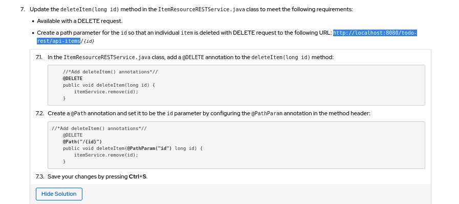 "Create a path parameter for the id so that an individual item is available with the following URL: api-items/" class="external-link" target="_blank" rel="nofollow noopener">http://localhost:8080/todo-rest/api-items/