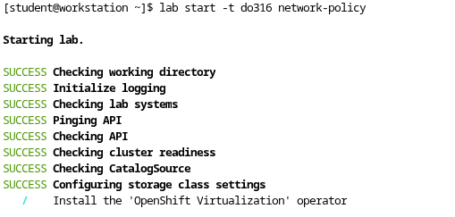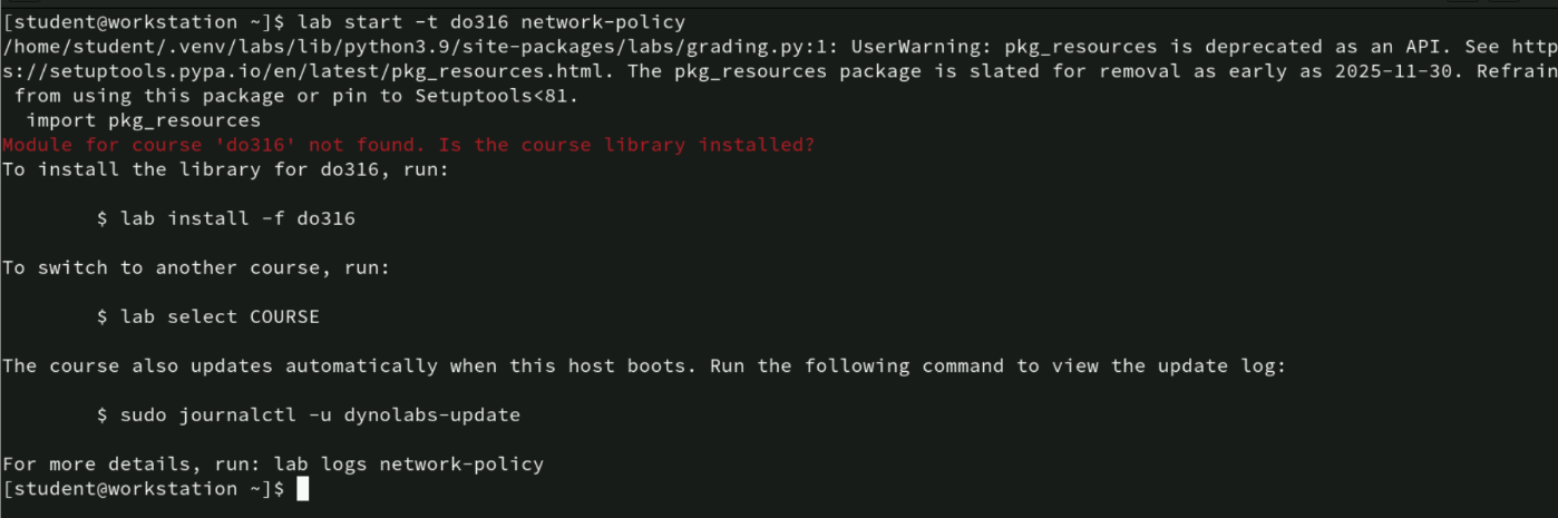 When attempting to start the network-policy lab using the lab start command, the lab fails with an error indicating that the do316 course library is not installed.