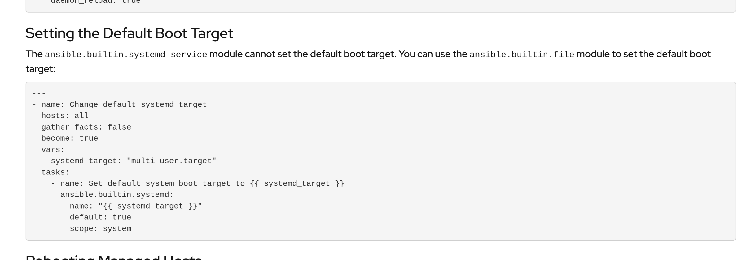 "The ansible.builtin.systemd_service module cannot set the default boot target. You can use the ansible.builtin.file module to set the default boot target:"