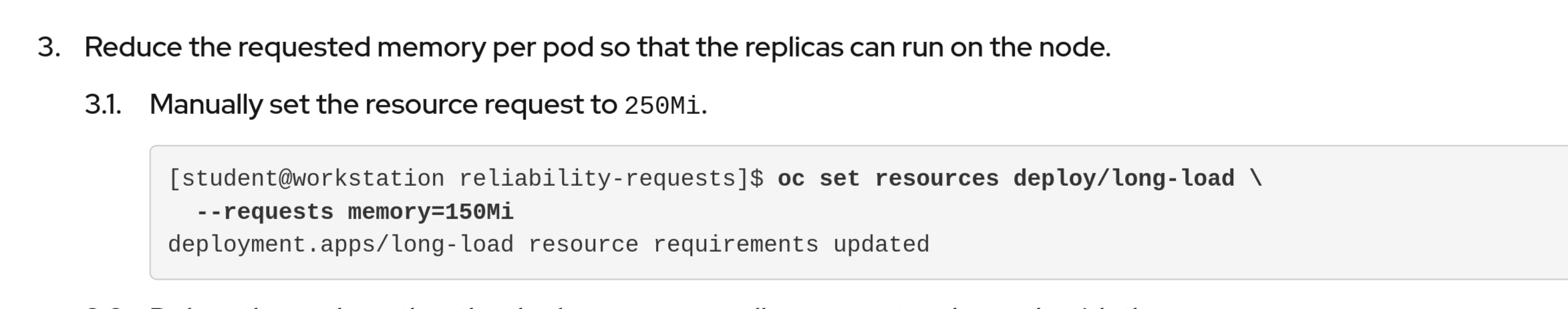DO180v4.18:Ch06s06: Step 3.1 includes the text "Manually set the resource request to 250Mi." but command block includes option for "memory=150Mi"