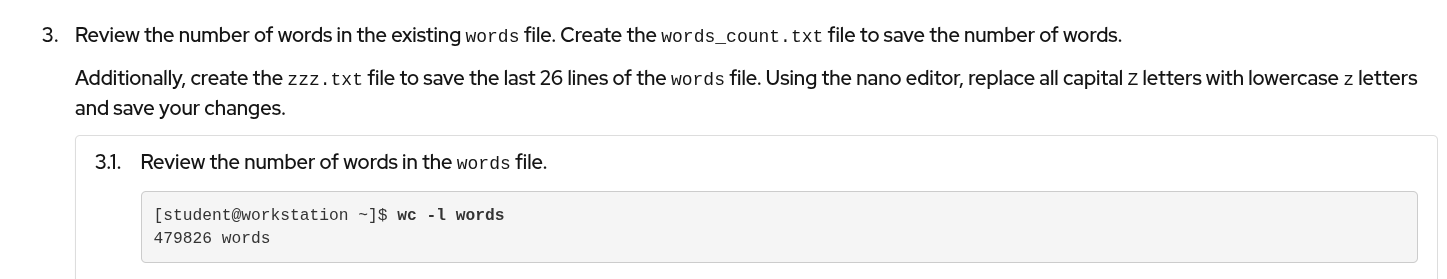 RH104: Ch03s07: Step 3.1 should be "wc -w" instead of "wc -l"