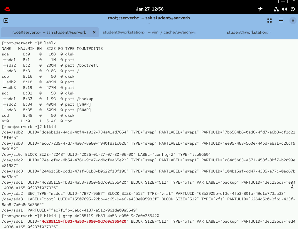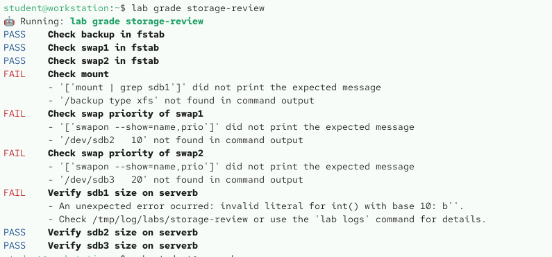 rh0037l-10.0 + after rebooting serverb, the system changed all the mounted partitions from /dev/sdb to /dev/sdc, making the grading script fail