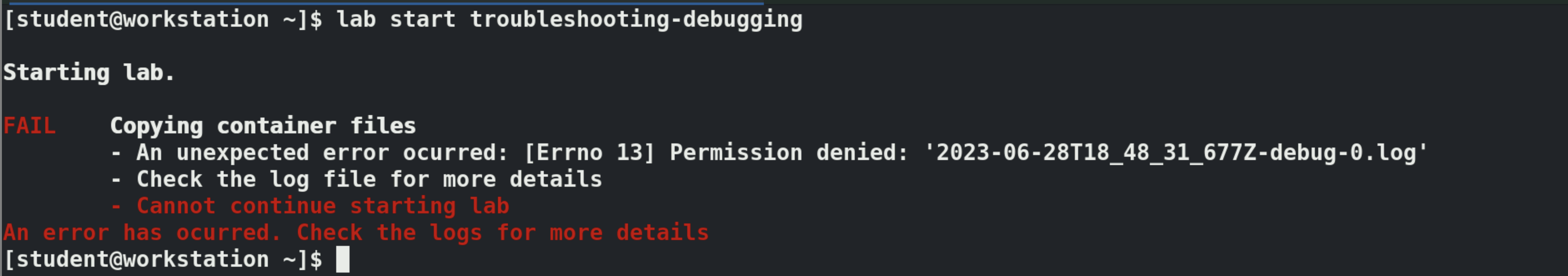 Workaround: sudo rm -rf ~/DO188/labs/troubleshooting-debugging/nodebug/.npm