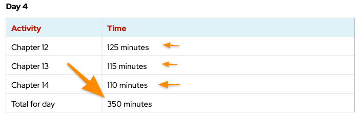 For example, Chapter 12 shows here at 125 minutes, but it is actually 140 minutes when you go to the Chapter 12 timing breakdown. So we are already 15 minutes off for the daily time. Chapter 13 indicates it takes 120 minutes while Chapter 14 indicates that it takes 130 minutes, so we are now another 25 minutes off for the daily time. If you take that into consideration, the Total for day should be 390 minutes and not 350 minutes as for just the single day, we were a total of 40 minutes off the mark.