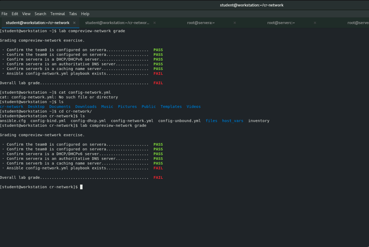 Description: Performing exercise 12.2 found no issues on the lab however when grading is not able to find the ansible playbook configure-network.yml.