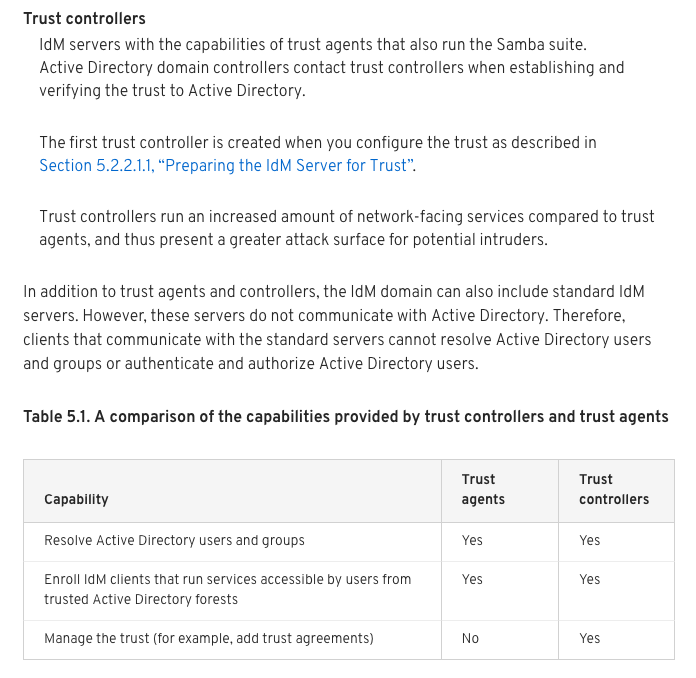 Description: In the table, it says: "Manage trust; for example, adding a trust agreement: Trust Agent: No". How is that to be understood? I can run run ipa-adtrust-install on any IdM server, thereby adding a new trust agreement. In other words, I do not have to be a TC, not even a TA, in order to 'add a trust agreement'.