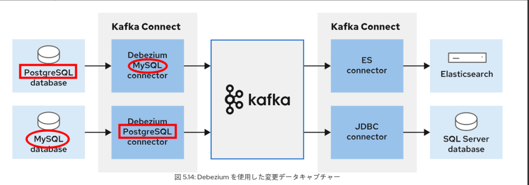 Description: In Fig 5.14, PostgreSQL database is connected to Debezium "MySQL" connector and vice versa.