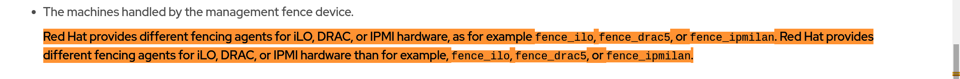 Red Hat provides different fencing agents for iLO, DRAC, or IPMI hardware, as for example fence_ilofence_drac5, or fence_ipmilan. Red Hat provides different fencing agents for iLO, DRAC, or IPMI hardware than for example, fence_ilofence_drac5, or fence_ipmilan.