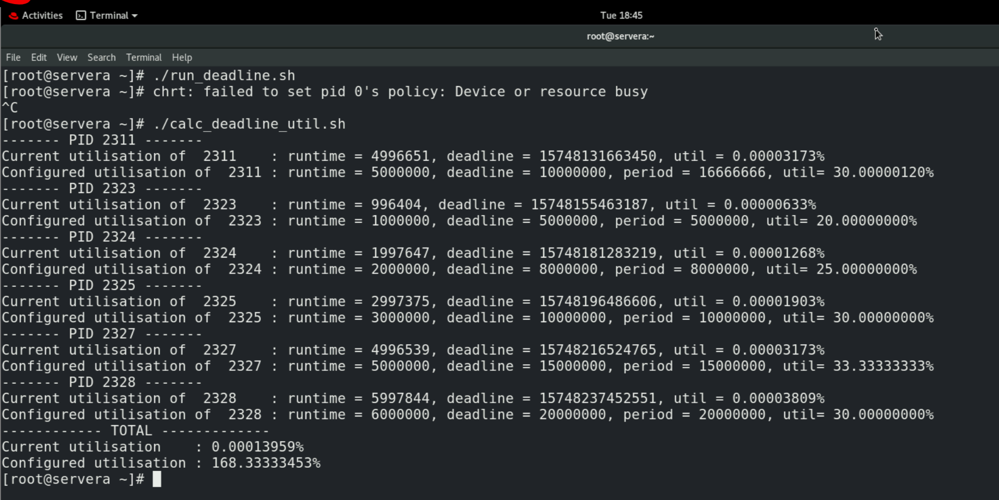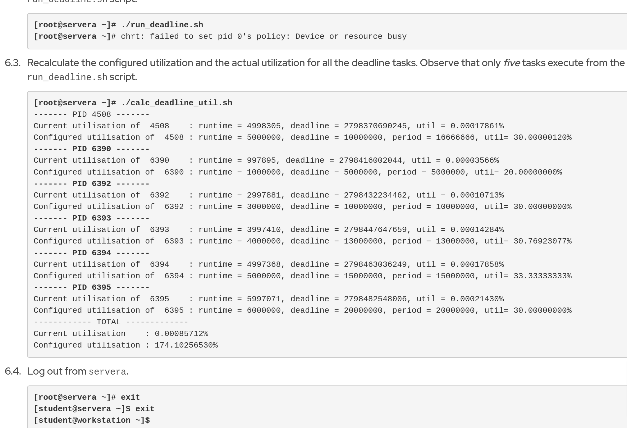 Issue description: RH442 ch07s02: step 6.2 & 6.3 is not explained enough to get what is happening. Why was 6th task not allowed to execute ? which is the sixth task / pid ? 6395 ? How was 5th task allowed then ? This step needs more explanation to understand wha are we observing and why it is happening like this ? Is it correct that : In the example that you provided, the deadline scheduler is configured to allow a total utilization of 30%. However, the actual utilization of the deadline tasks is 174.10256530%. This means that the deadline scheduler is overloaded but then how 5th task was allowed. Also the scripts used to calculate is a nightmare to look or understand. we expect a lot of explanation in step 6.3 like for each pid how current and configured util has so varied high ranges but suddenly it ends at lab finish command.