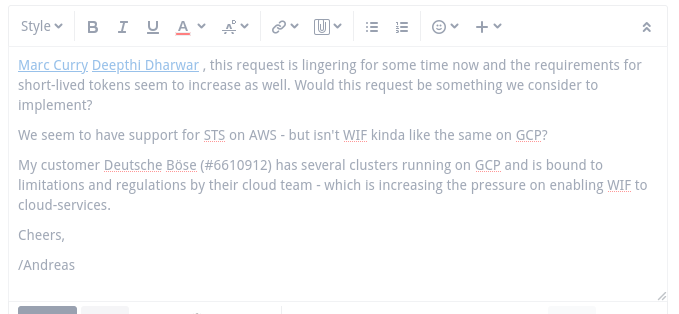 Our cloud-team managing the GCP environment applied policies to only allow WIF enabled connections to GCP services. The external DNS operator would allow us to to dynamically create DNS entries for services running on OpenShift - this is currently not possible due to WIF requirements by the regulations.