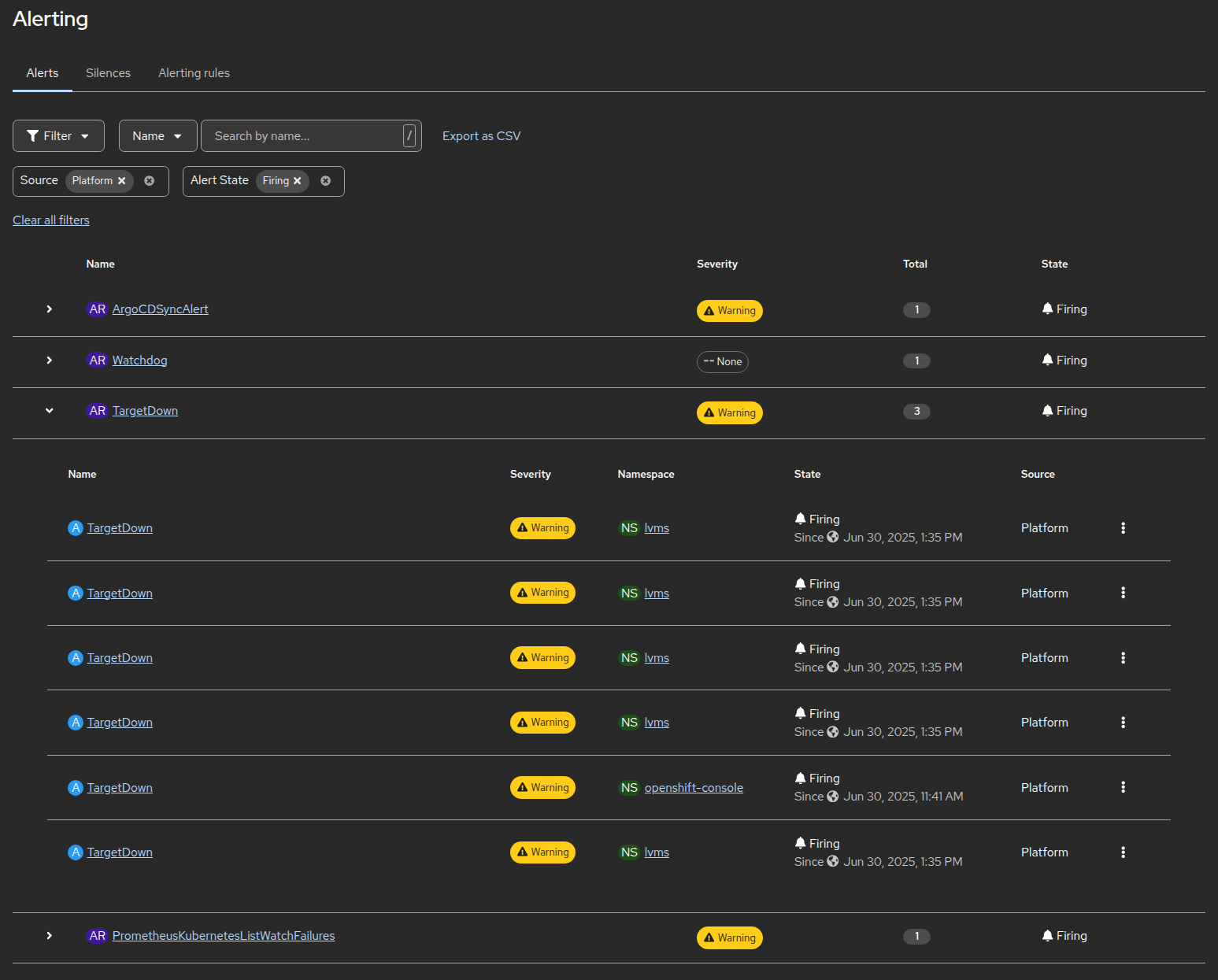 There are other alert rules that can flood the Alert panel, too. For example, if a single node in the cluster is down, we get a lot of KubeDaemonSetRolloutStuck alerts. One for each DaemonSet deployed in the cluster.