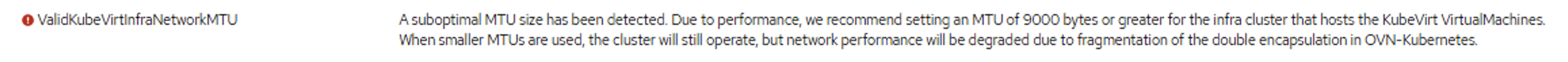 Installing a hosted cluster with KubeVirt using a secondary network should not show an error about the recommended MTU of 9000, as the secondary network uses an MTU of 1500, which is normal.