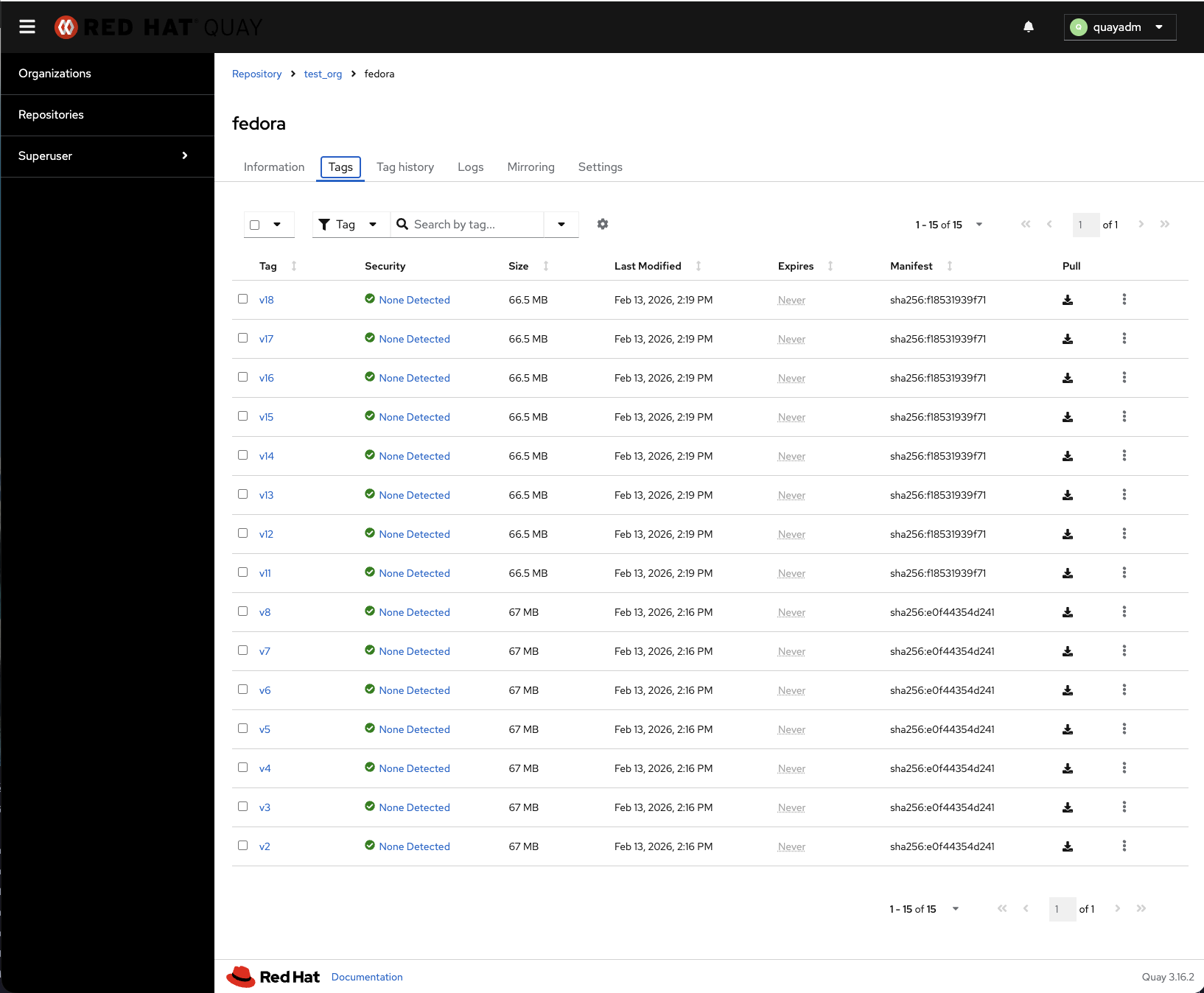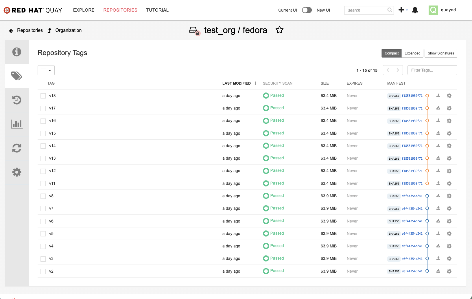 In the New UI, although the manifest digest is displayed per tag, there is currently no visual grouping or indication that multiple tags share the same manifest. This makes it harder to quickly understand tag relationships, especially in repositories with many versioned tags.