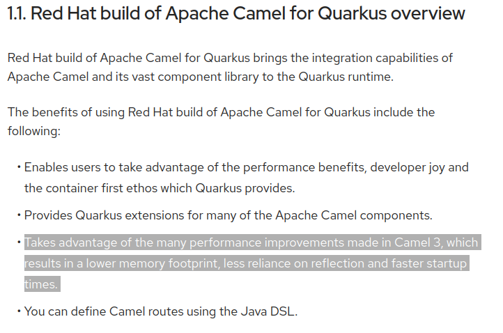 Takes advantage of the many performance improvements made in Camel 3, which results in a lower memory footprint, less reliance on reflection and faster startup times.