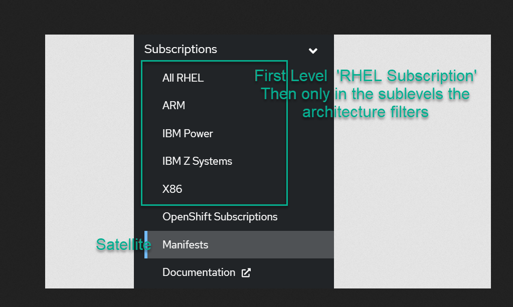 The menus listed below Subscriptions has first 5 entries all belonging to 'RHEL Subscriptions' but then with different architecture filters. Then there is the entry for OpenShift subscriptions. And then suddenly the 'Manifests'.