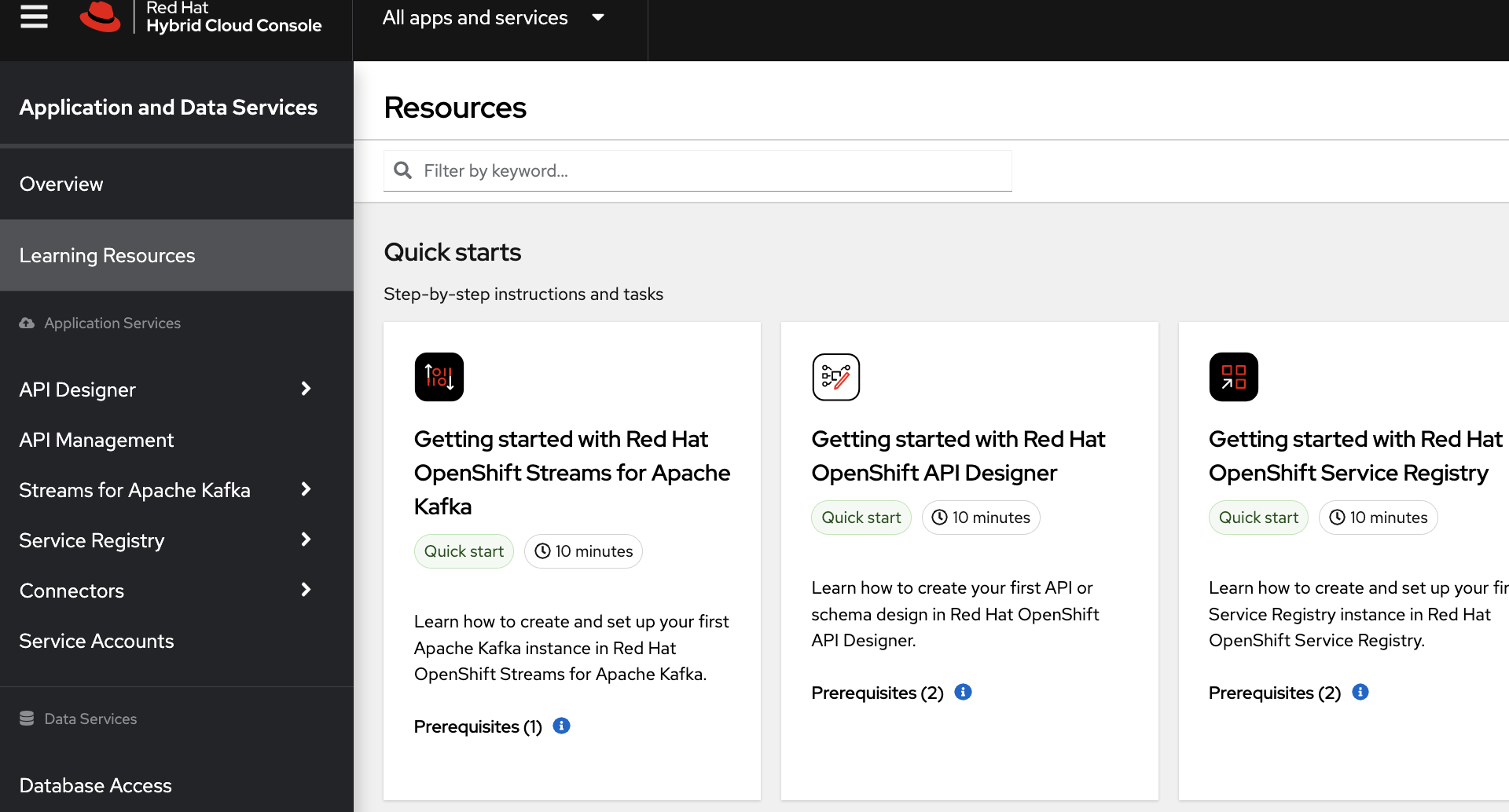 This model follows what Application and Data Services does here (screenshot also attached: https://console.redhat.com/application-services/learning-resources