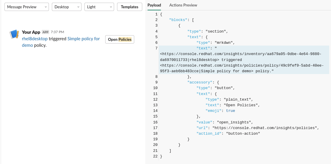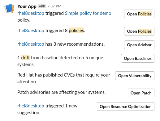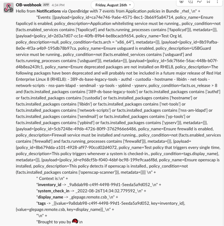 'Hello from *Notifications* via _OpenBridge_ with {data.events.size()} event{#if data.events.size() > 1}s{/} from Application _{data.application}_ in Bundle _{data.bundle}_\n" + "Events: {data.events} \n" + "{#if data.context.size() > 0} Context is:\n" + "{#each data.context}*{it.key}* -> _{it.value}_\n" + "{/each}{/if}\n" + "Brought to you by :redhat:\n',