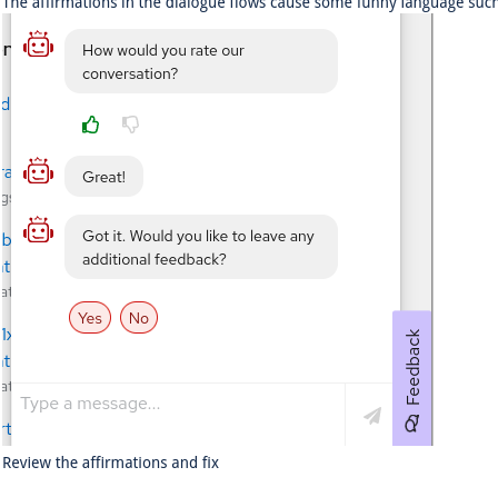 For this specific flow – let's remove "got it' from the "would you like to leave any additional feedback" bubble.