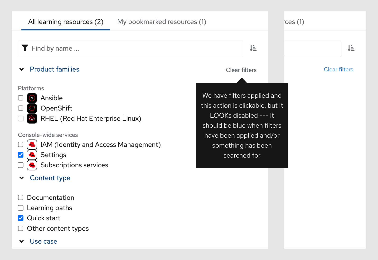 ‘Clear filters’ link button using disabled state even when clickable on ‘All learning’ page. See screenshot below with current implementation on the left and correct treatment on the right: