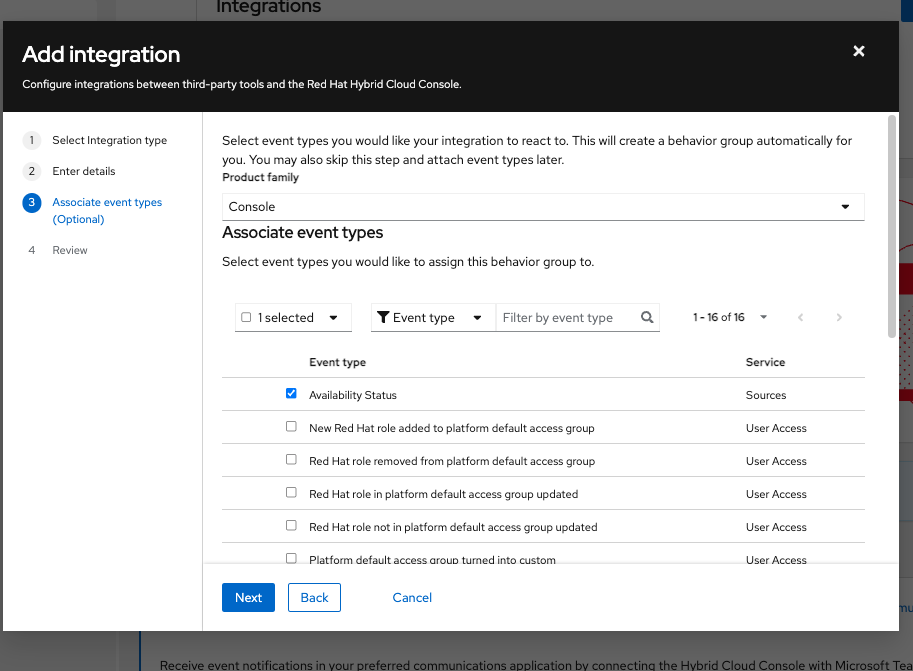 When configuring an integration (in step 3, Associate event types), the Availability Status event shows it's linked to the 'Sources' service.