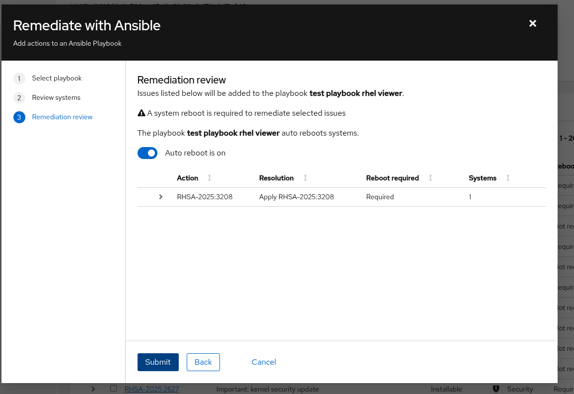 - *If no playbooks exist in the view, another user with write permissions is going to need to click on a system in the system view, select an advisory, click on "Plan remediation' and follow the modals to generate a playbook.