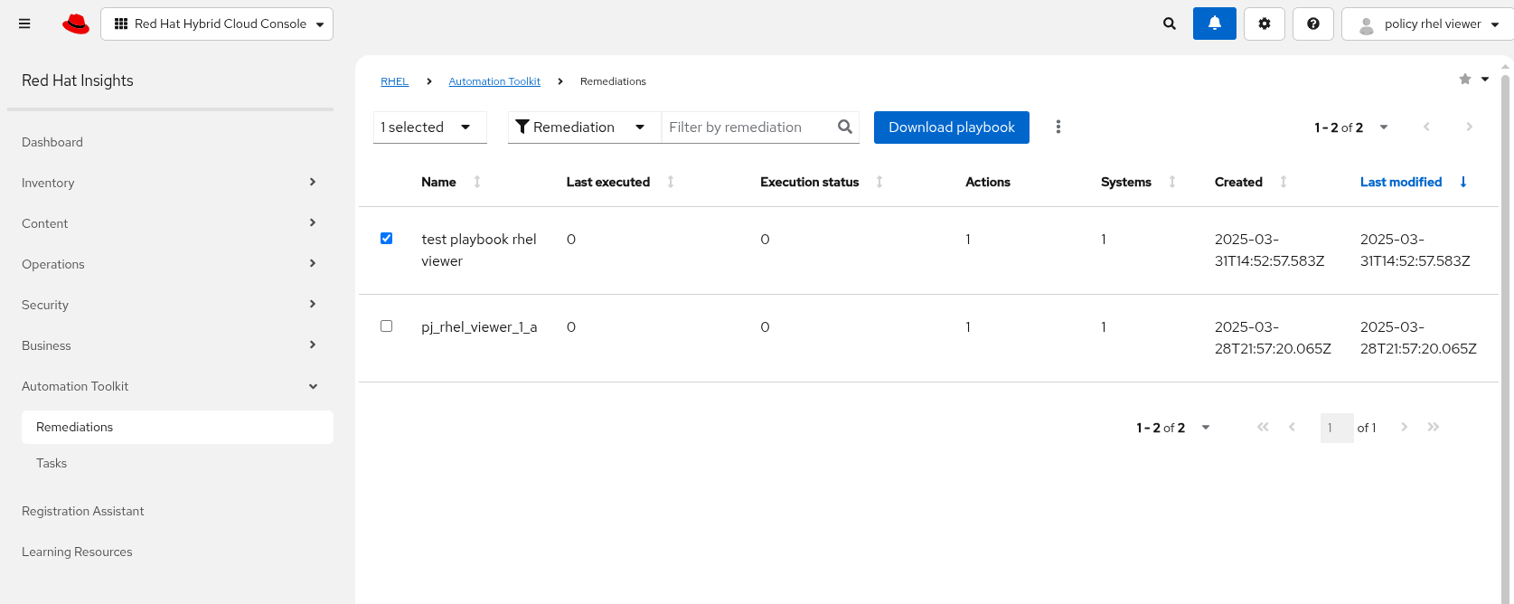 I have created a user (policy-rhel-viewer-1) that does not have any remediations roles (I removed these from the default/custom access group) and does have the RHEL viewer role (no RHEL admin or rhel operator role). This user can download remediations playbooks.