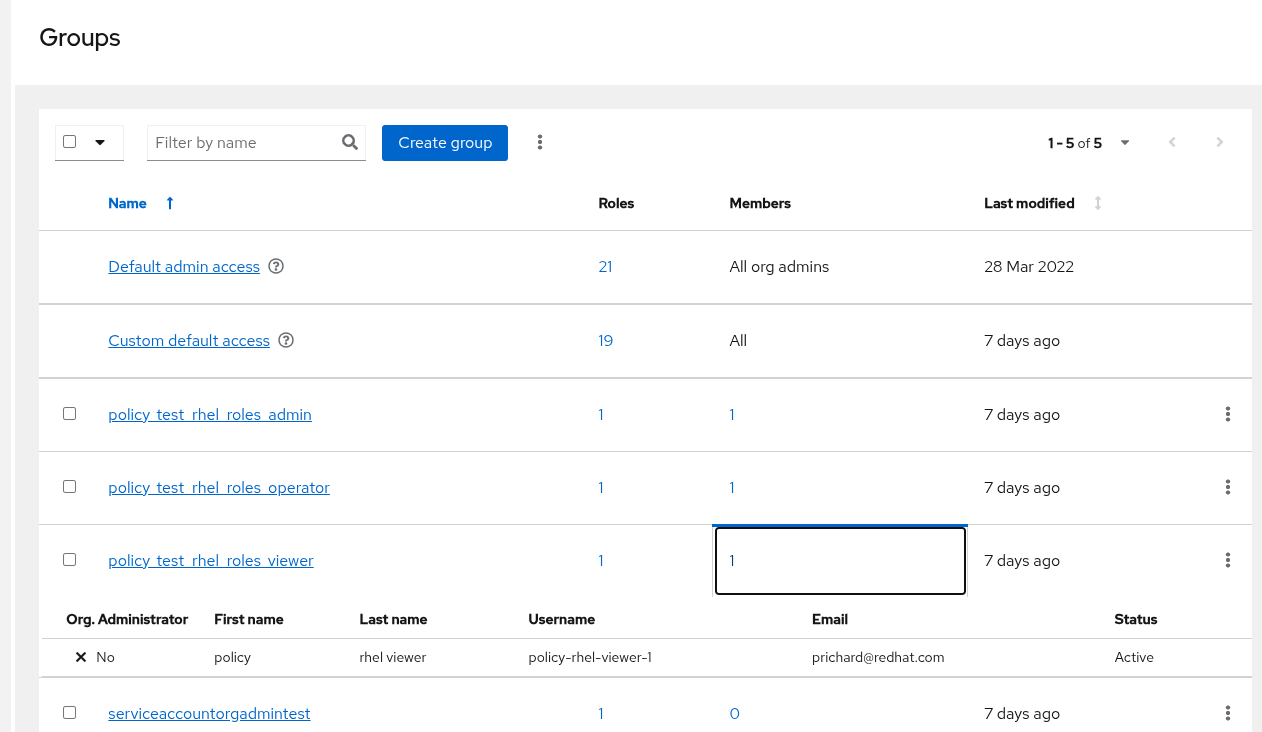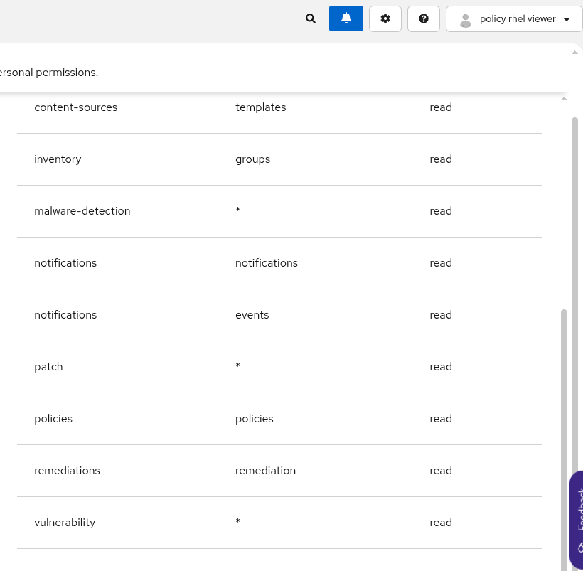 - create a user that does not have any remediations roles (I removed these from the default/custom access group) and does have the RHEL viewer role (no RHEL admin or rhel operator role). A group with the rhel viewer role will need to be created and the user added to it.