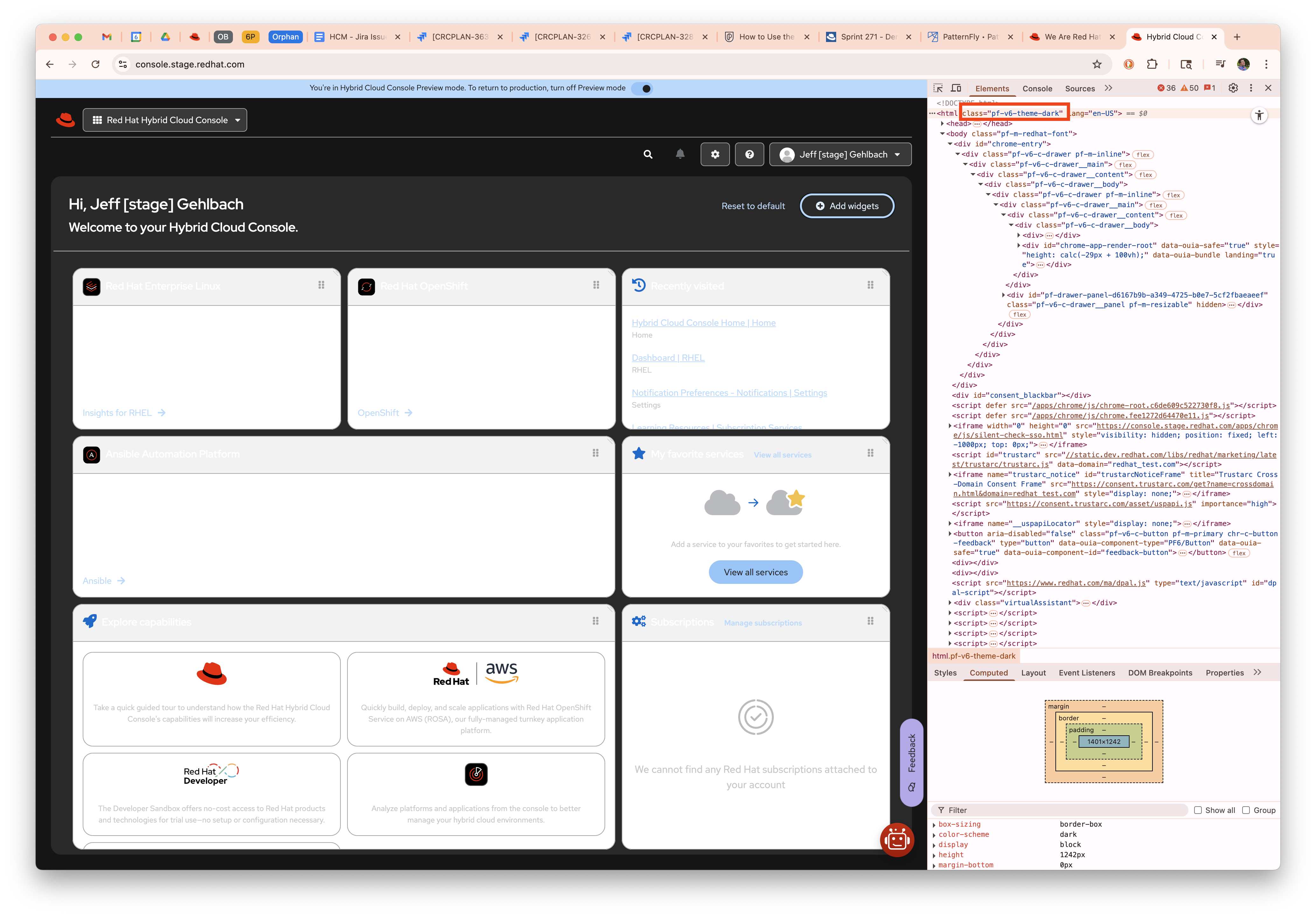 For grins, I threw stage into dark mode via dev tools. It seems we get quite a bit for free just by having done a bunch of PF6 work. As of June 6 2025, none of the widgets responded; I don't know off hand whether that's down to incomplete PF6 work, to the presence of charts / images, or some combination. Here's what I got, anyway.