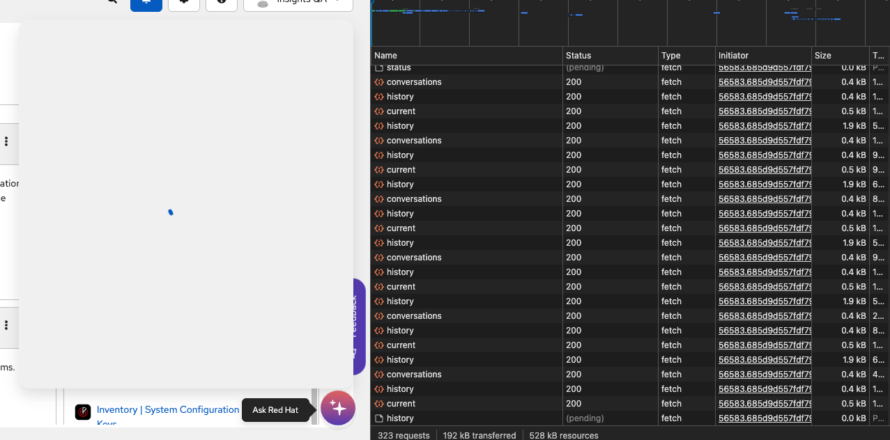 This will result in a large queue of network requests building up in the console. They first show up as pending and very slowly resolve. Until all of the requests resolve, the UI is blocked from rendering the assistant.
