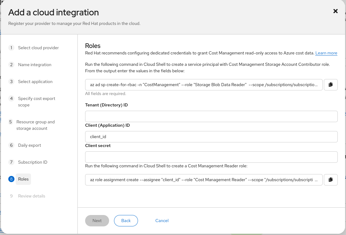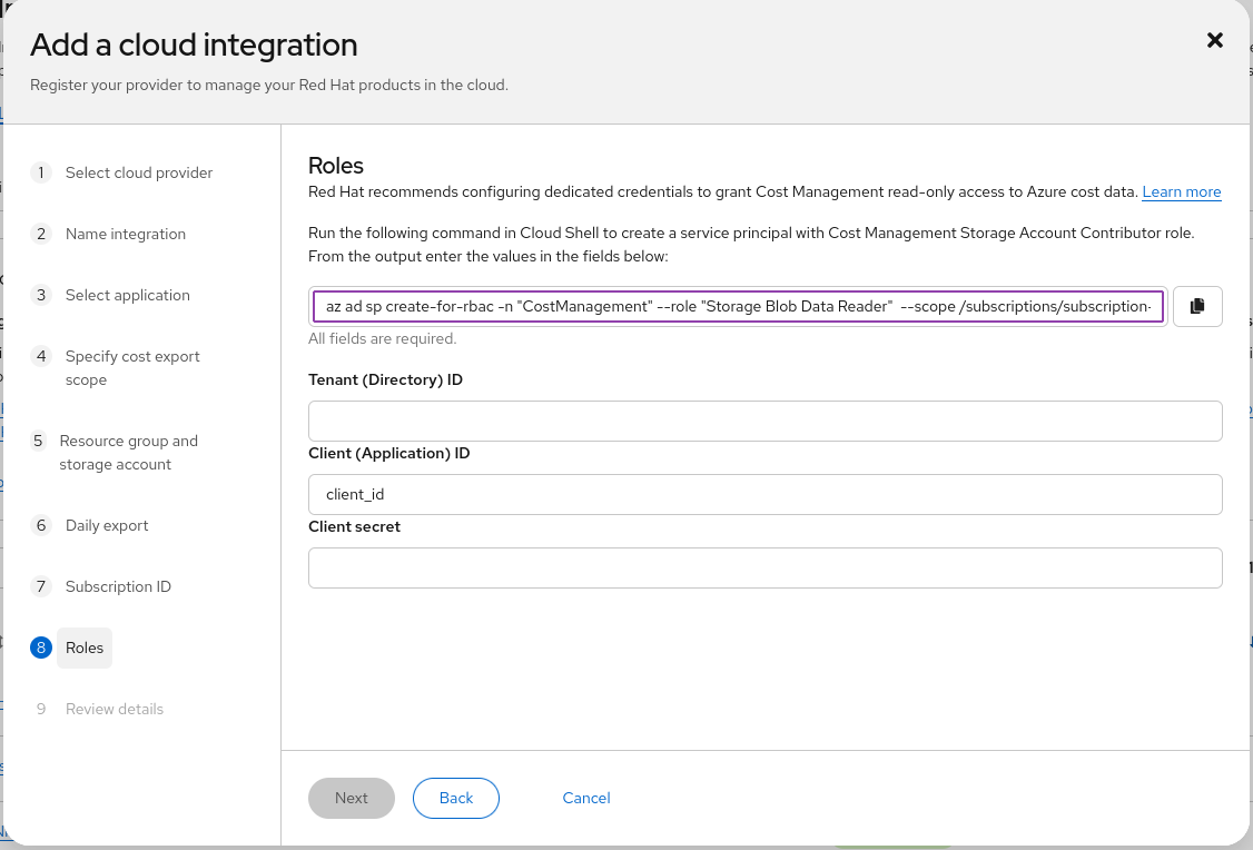 az ad sp create-for-rbac n "CostManagement" --role "Storage Blob Data Reader" -scope {scope} --query '{"tenant": tenant, "client_id": appId, "secret": password}'