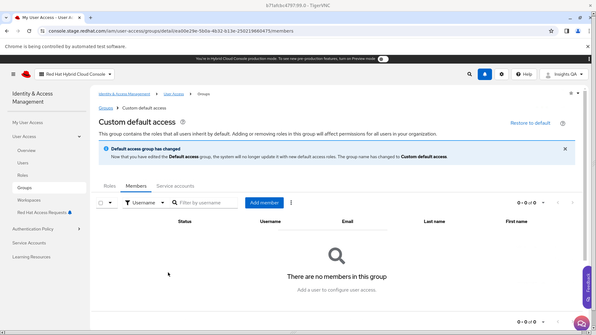 See attached screenshot for example. The custom default access group, which contains all members, shows "There are no members in this group" on the Members tab of the group details page.