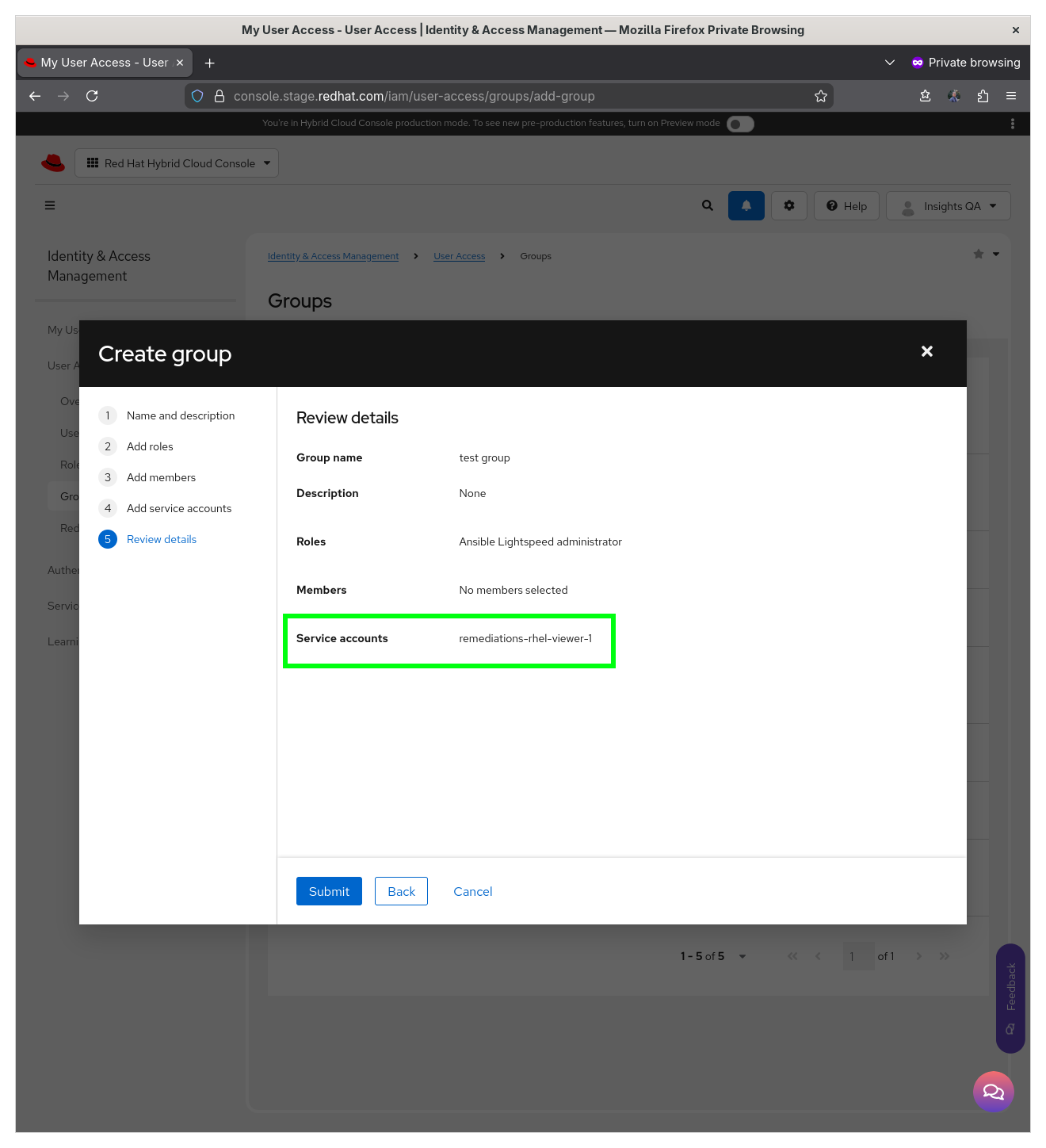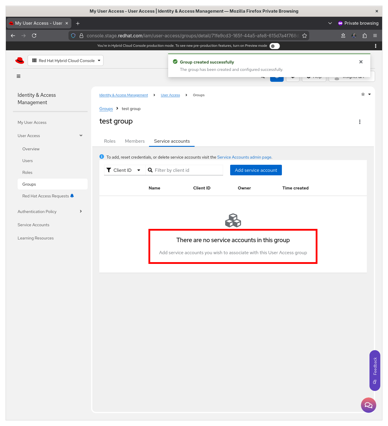 The RBAC web UI doesn't add service accounts to brand new groups. This happens in both prod and stage at https://console.redhat.com/iam/user-access/groups/add-group . Illustration: