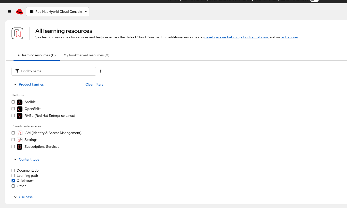 No content when filtering the learning resources page by quick starts