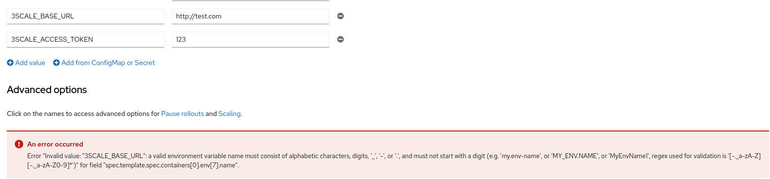 ', or '.', and must not start with a digit (e.g. 'my.env-name', or 'MY_ENV.NAME', or 'MyEnvName1', regex used for validation is '[-._a-zA-Z][-._a-zA-Z0-9]*'), spec.template.spec.containers[0].env[6].name: Invalid value: "3SCALE_ACCESS_TOKEN": a valid environment variable name must consist of alphabetic characters, digits, '', '', or '.', and must not start with a digit (e.g. 'my.env-name', or 'MY_ENV.NAME', or 'MyEnvName1', regex used for validation is '[-._a-zA-Z][-._a-zA-Z0-9]*')]Expected Behavior