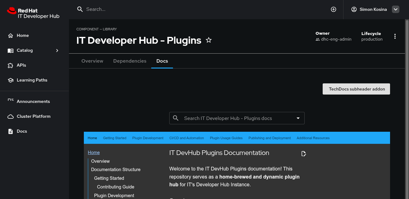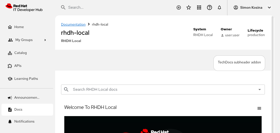 Running RHDH 1.7 with TechDocs enabled and a TechDocs addon registered in the subheader location.