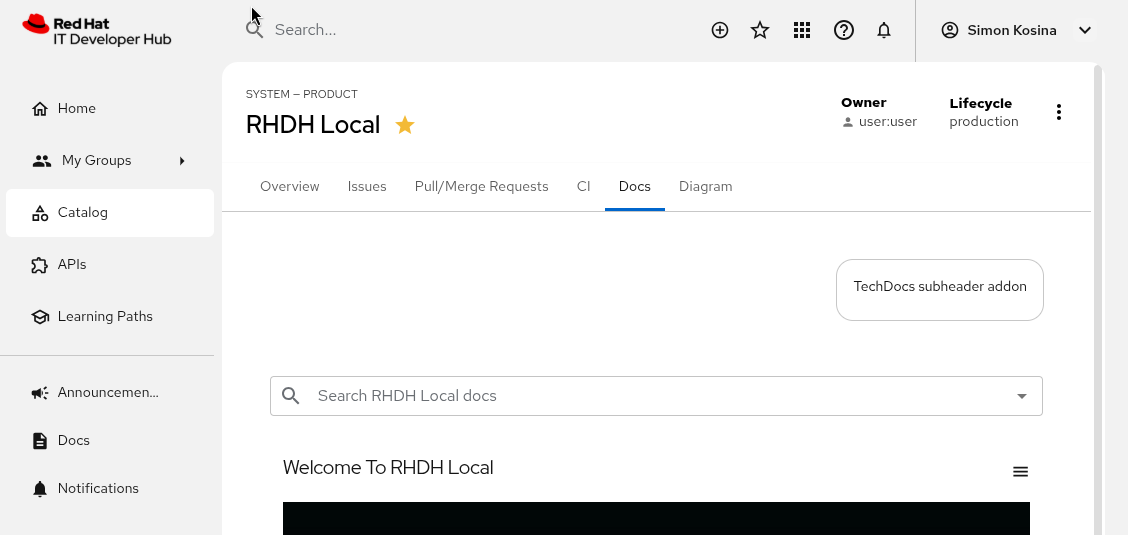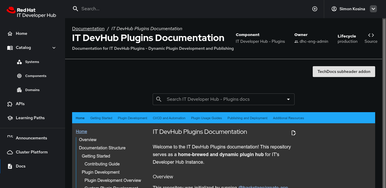 Go to "Docs" page in the left navigation panel and display the TechDocs documentation for a given entity.
