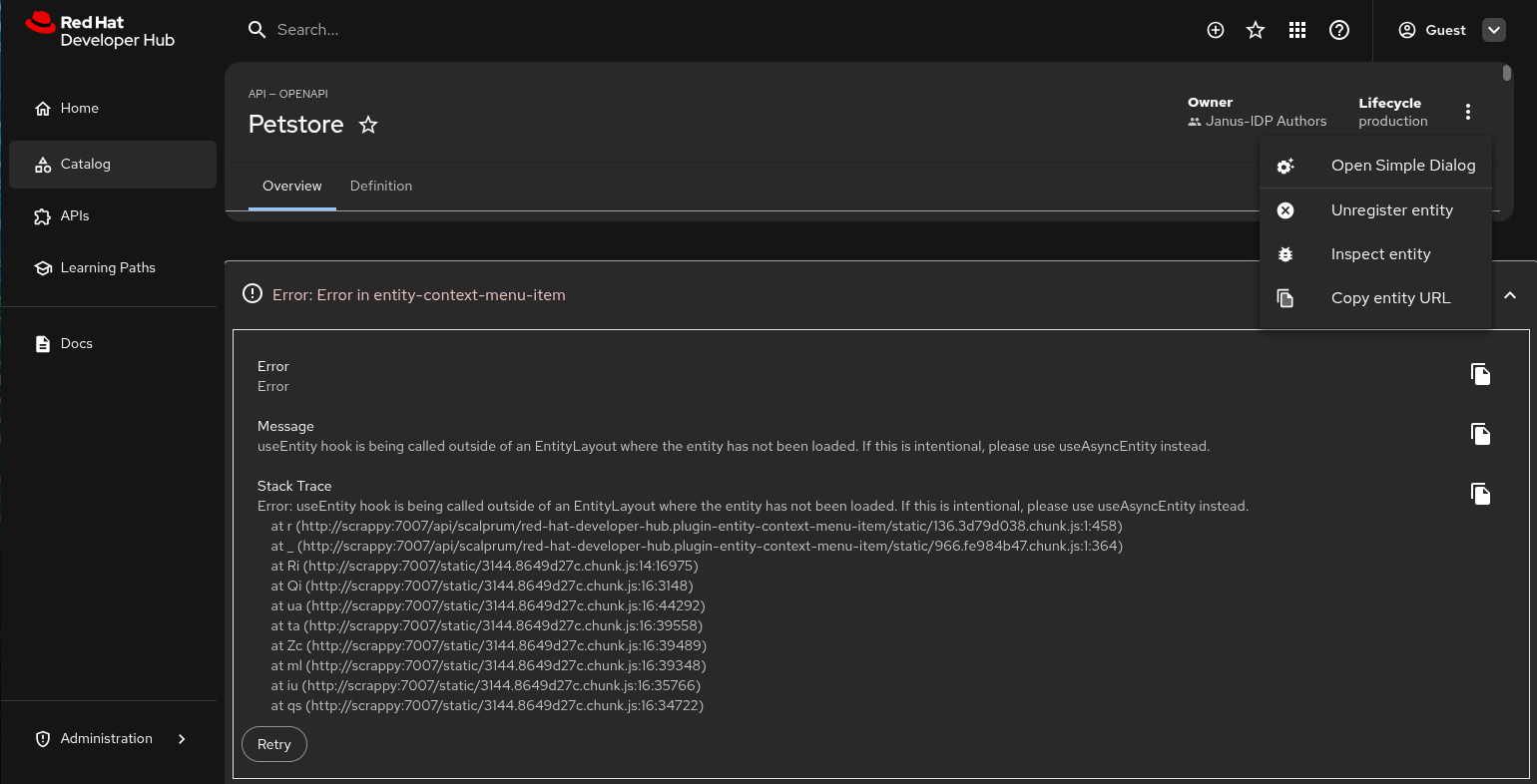 It's possible to add custom entries to the context menu of the entity page in Developer Hub via the entity.context.menu mount point from a dynamic plugin. However components using this mount point cannot access the catalog entity being viewed using the normal useEntity hook and encounter the following error when accessing the catalog entity page: