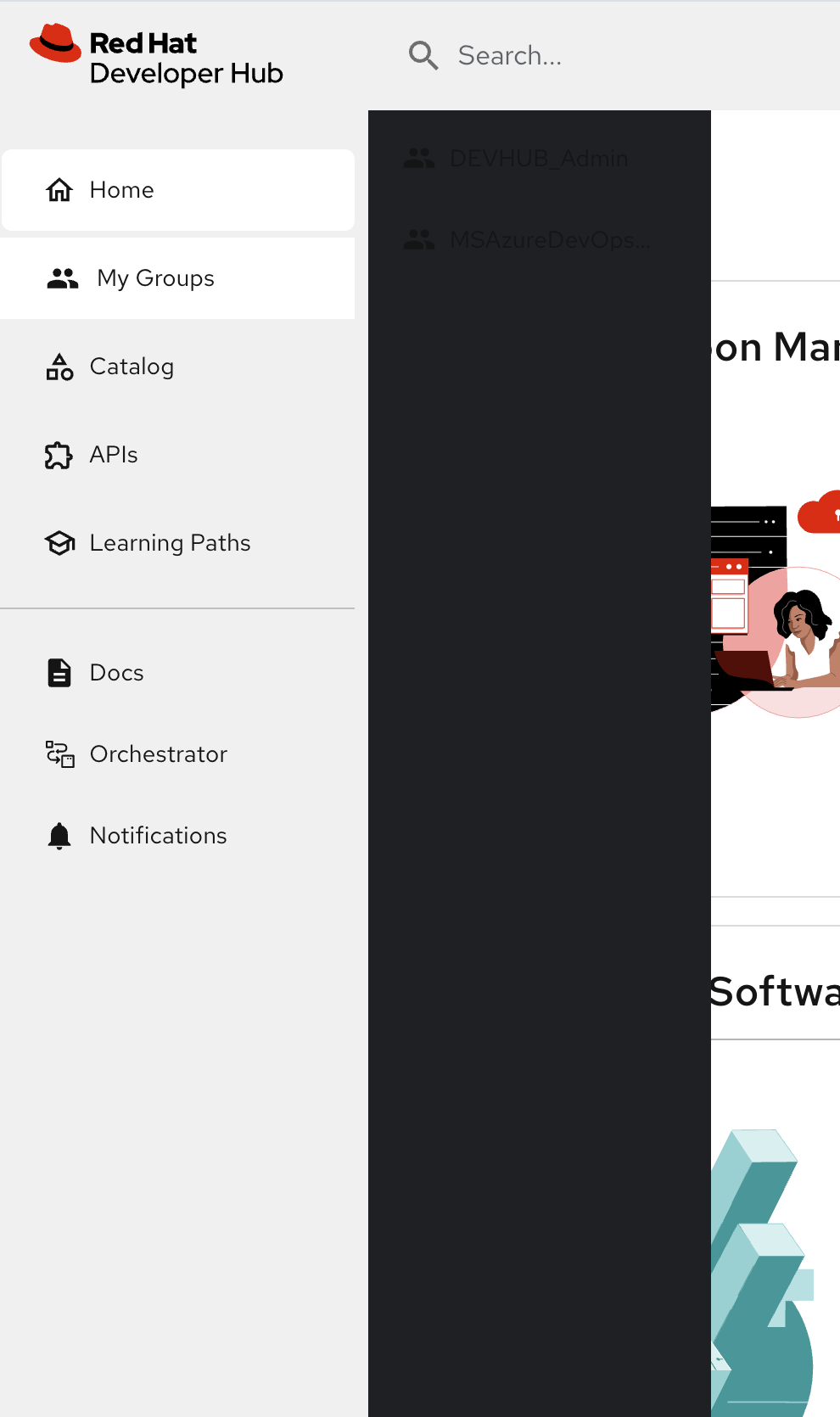 The light theme of Developer Hub 1.7 has a black bacground with black text for the "My Groups" submenu, so it's impossible to read its content.