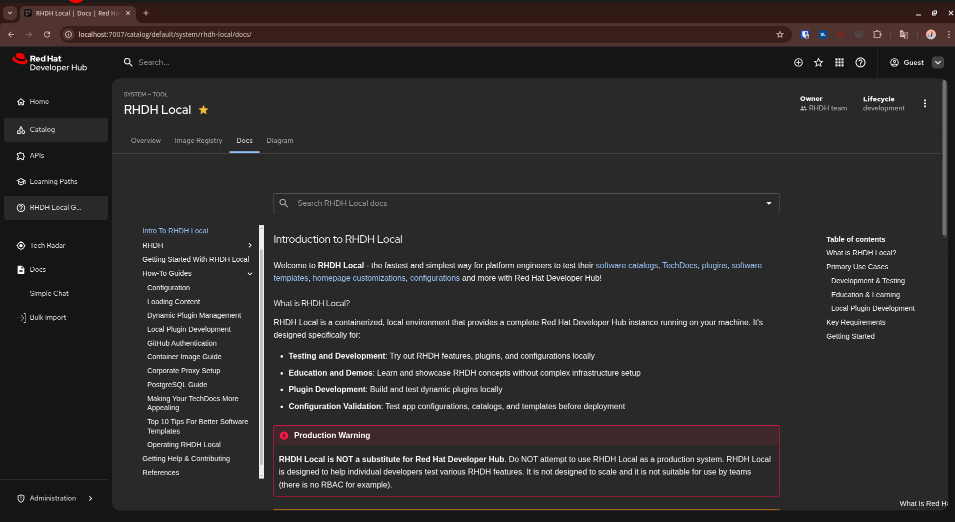 3. Click on the dedicated "RHDH Local Guide" link in the UI sidebar