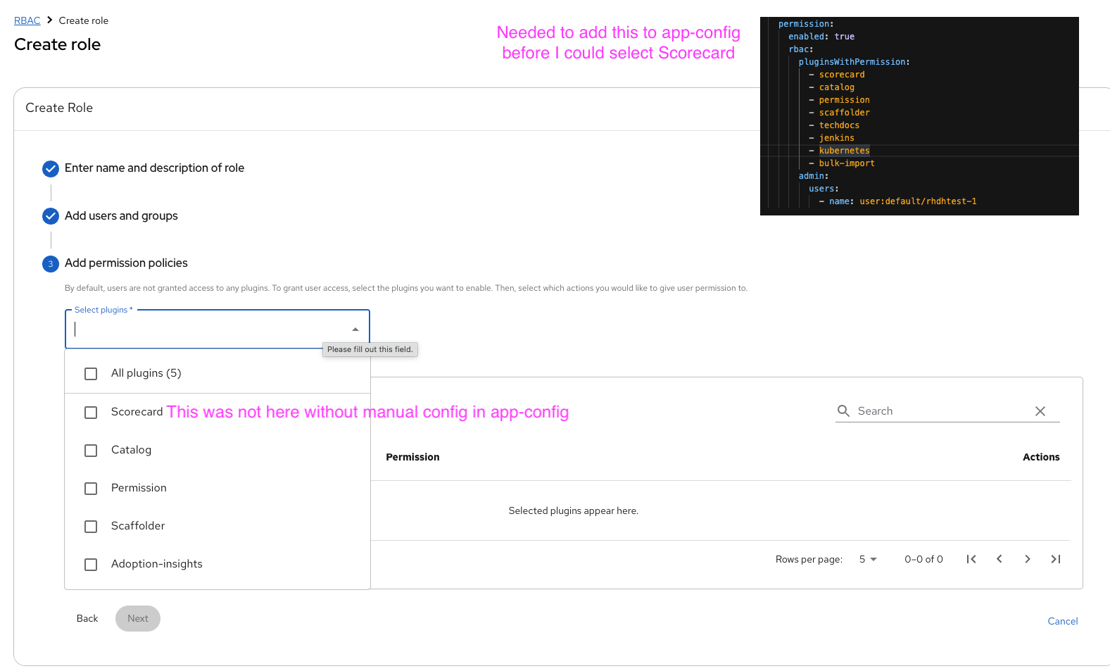 After enabling RBAC in the test instance, and getting a missing permission message when trying to view a scorecard, when I went to the RBAC UI, Scorecard wasn't offered as a plugin to select. Had to manually add more to app-config (which is not in the docs), and wait for RHDH to come back up.