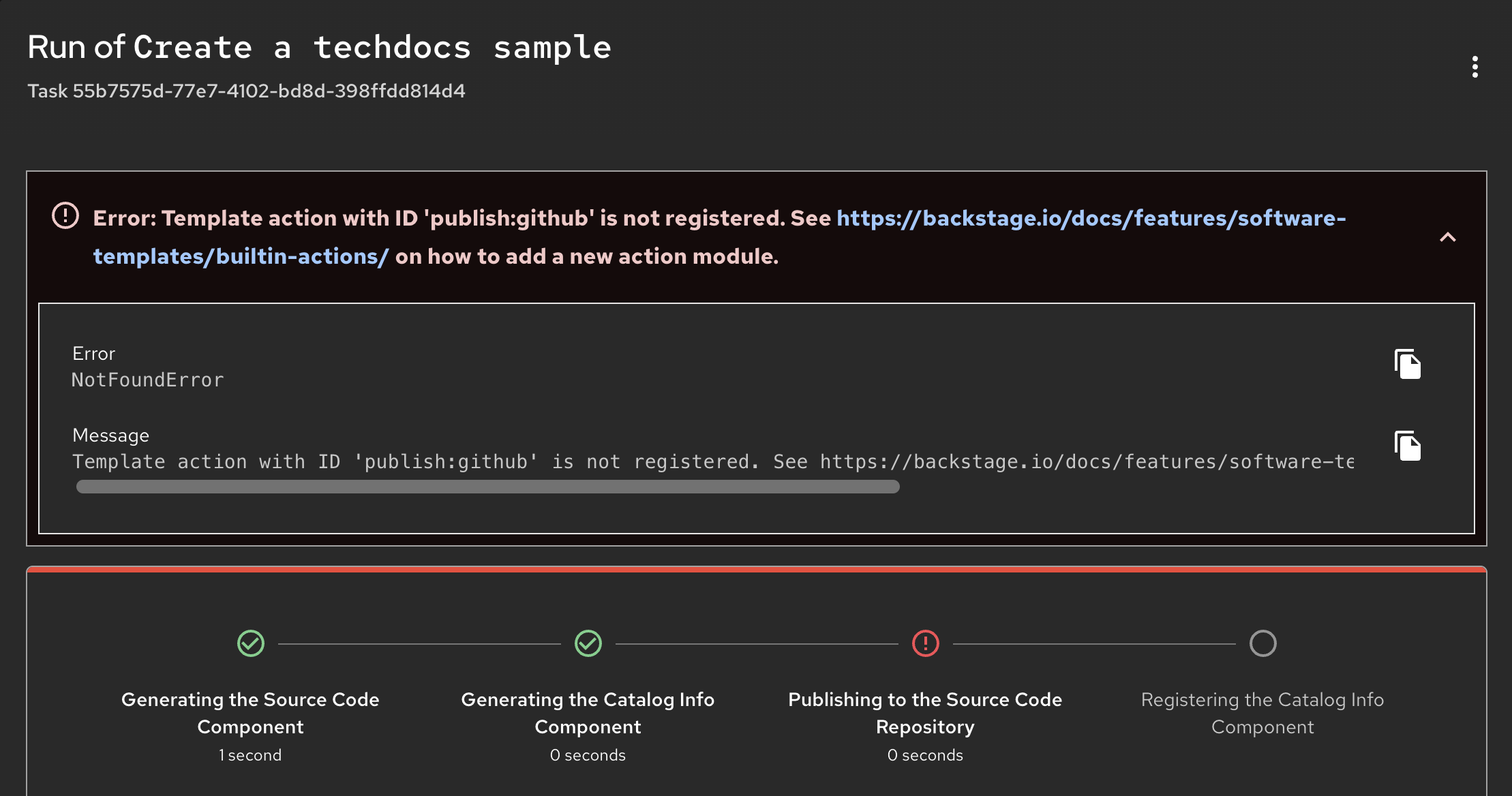 Template action to create a techdocs sample fails with an error message that links to Backstage docs