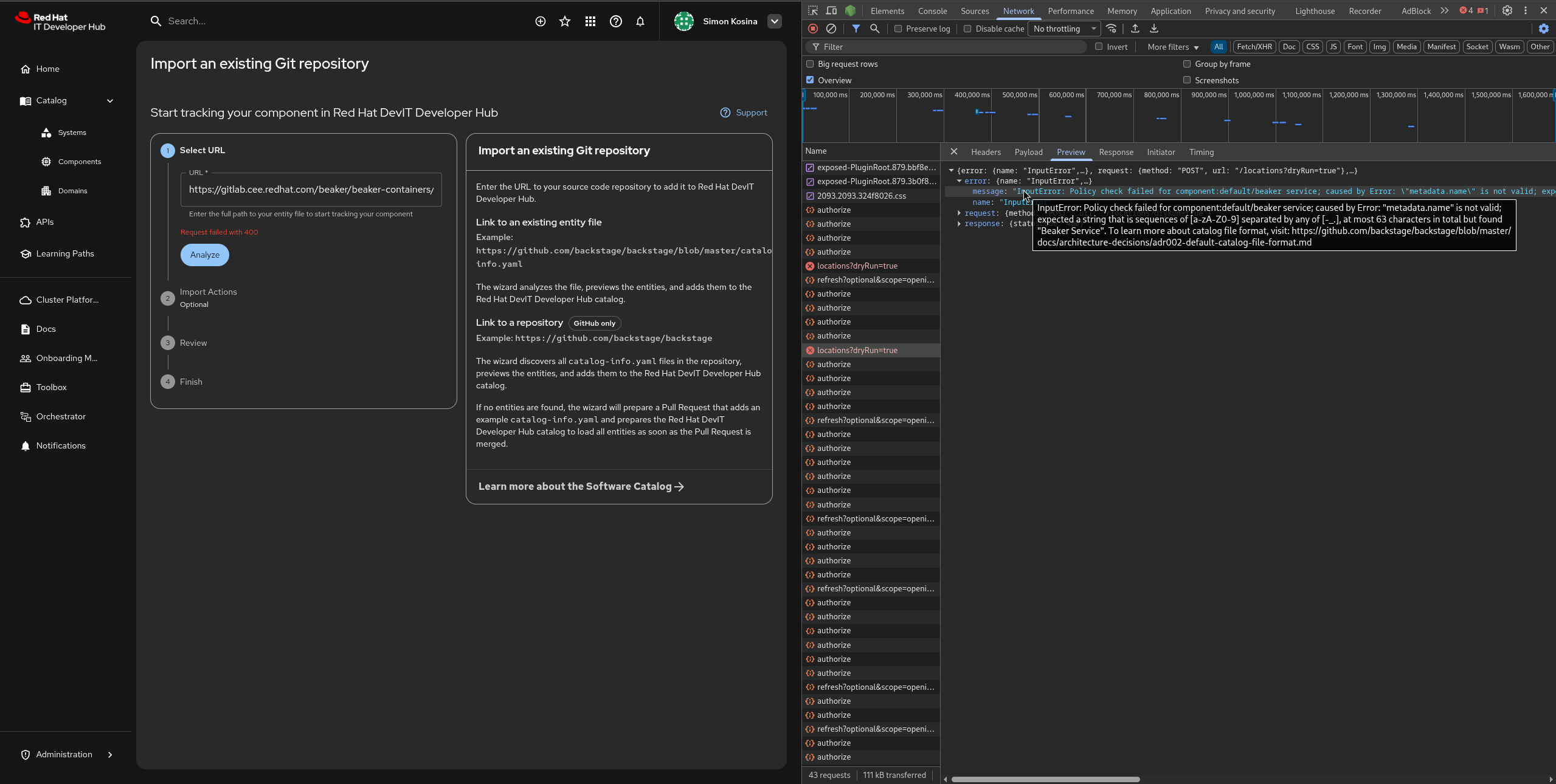 For example, user tried to register an entity file with an invalid "metadata.name" value. All that's displayed in the UI is the "Request failed with 400" message. However, when I check the catalog API response in the network tab, the error message clearly says what's wrong with the file (see screenshot).