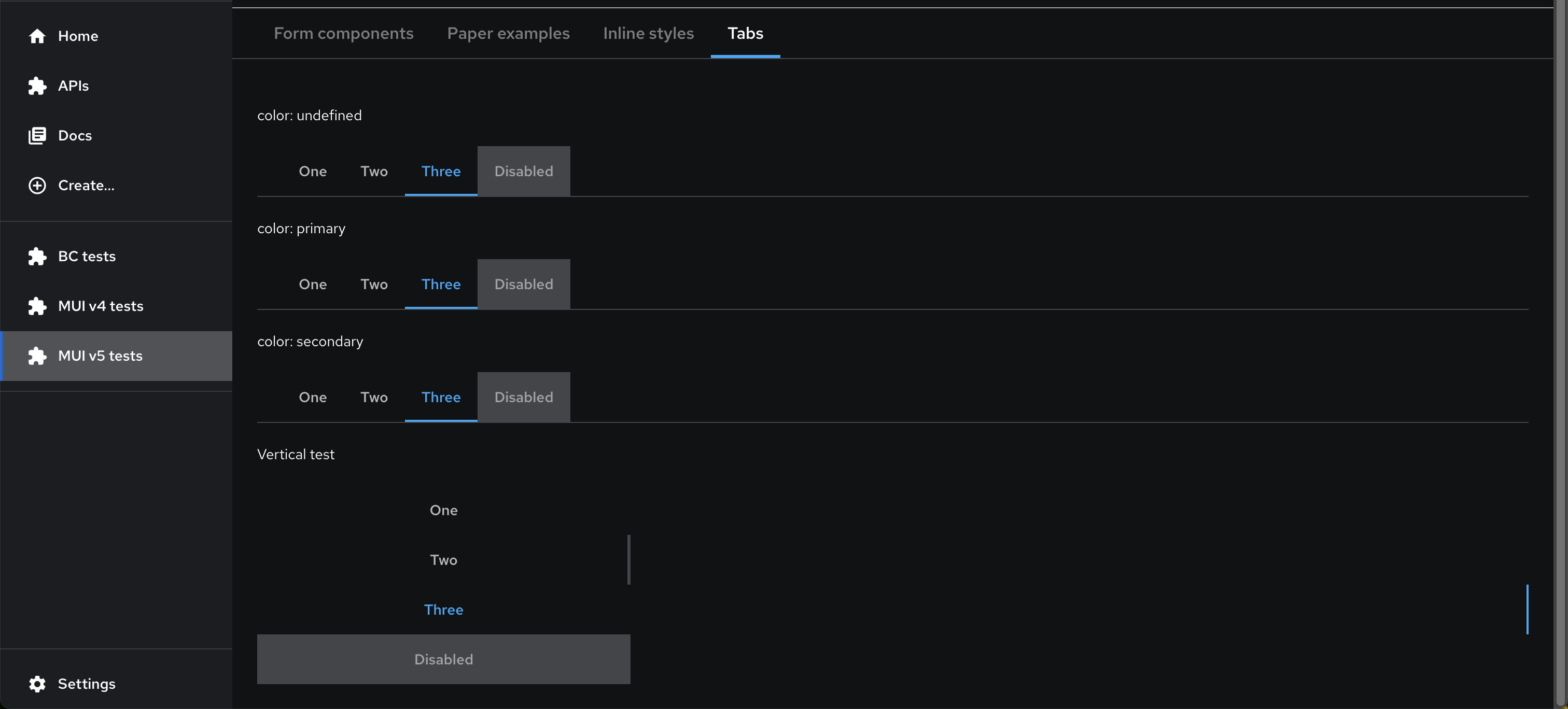 3. In the app, go to Mui v4 tests or Mui v5 tests page, Tabs tab