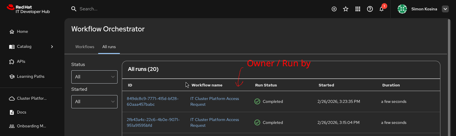When debugging failed runs it would be very beneficial to be able to see who triggered the workflow, both on the "workflow instance" page and also as a column in the "workflow runs" table (see screenshots).