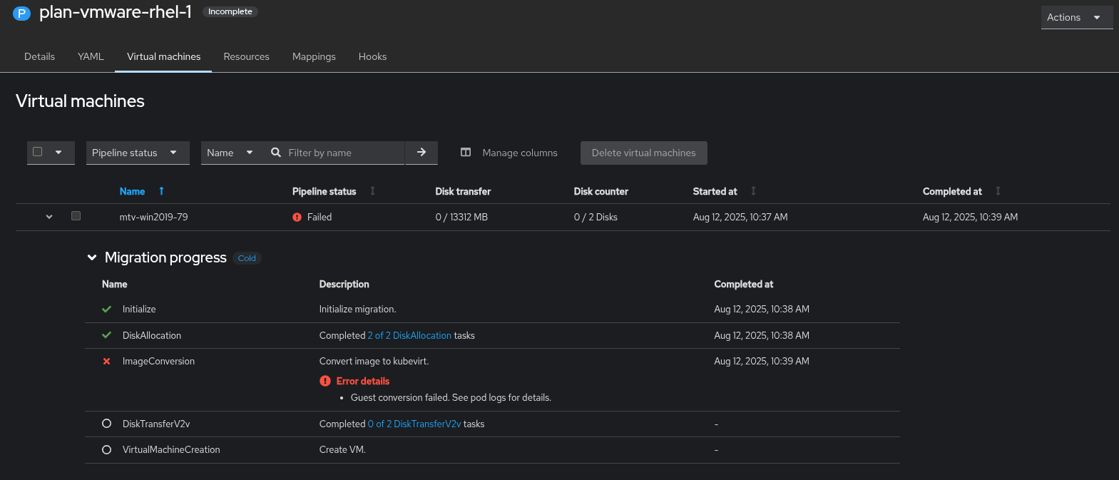 Cold migration VM 'mtv-win2019-79' from VMware 7.0.3 to OCP fails on 'ImageConversion'