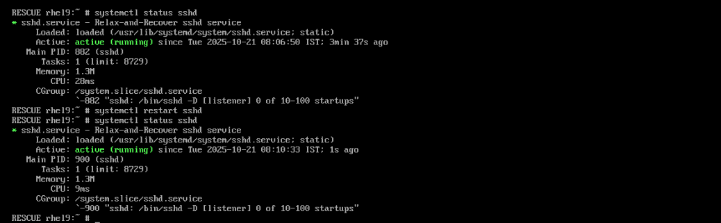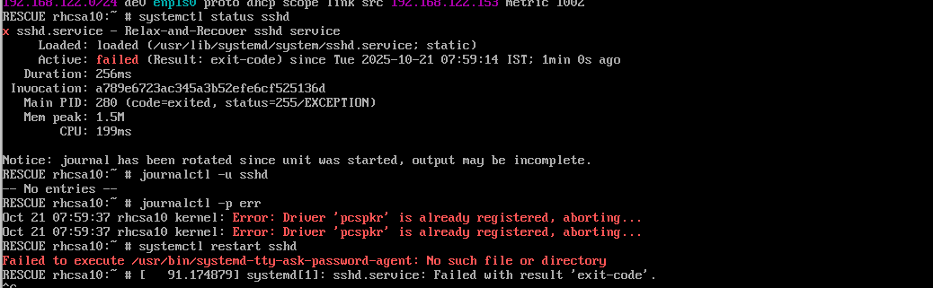 Unable to start sshd service  same is working in RHEL9 rear rescue booted system.