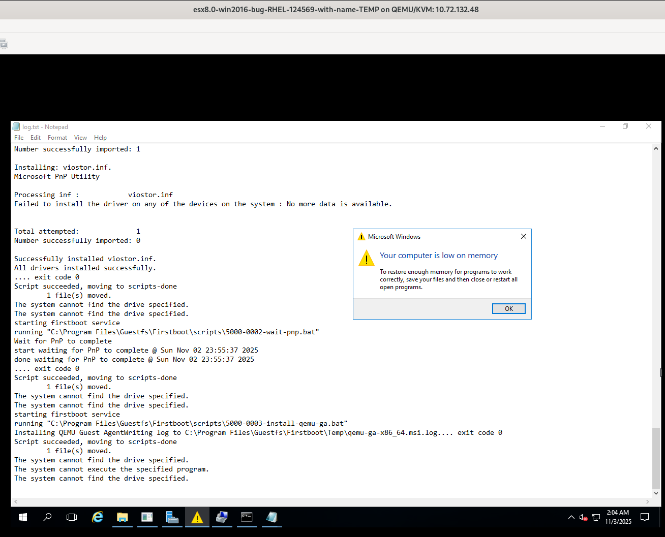 These Windows 2016 guests all show 'low on memory' and it's unclear whether insufficient memory is the root cause of this bug. Although most guest couldn't reproduce the bug.