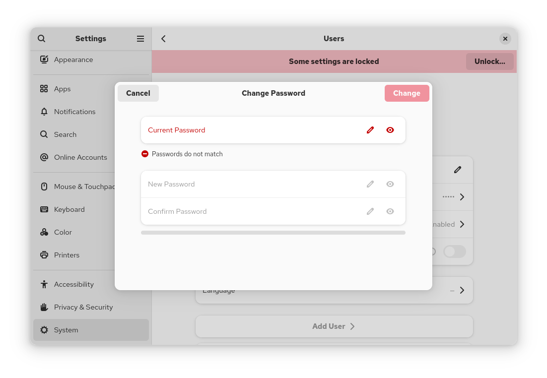 During a password change using the users panel, the old password is validated for the current user. However, the state of this validation is presented only by a css class (which does some color things), and no other indication is provided. That is no help for visually impaired users, but even for sighted ones it might not be helpful, as they have to guess what the color change means. At least a textual label would be needed in this case, and of course, a design which would allow a screen reader to figure out that the label is somehow important. This pattern is in place for several versions, at least from the F36 or so days, and survives to this release.